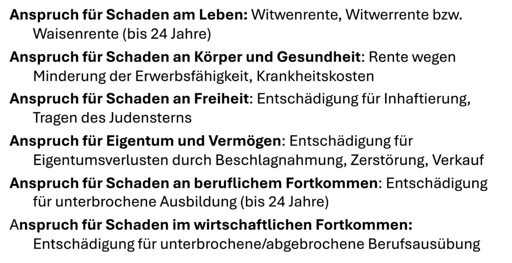 Ohne an dieser Stelle in die Details gehen zu wollen – das soll an anderer Stelle und in einem anderen Fall geschehen – muss man bei der Wiedergutmachung unterscheiden zwischen einem Restitutionsverfahren, mit dem die Eigentumsverhältnisse an Vermögenswerten (Immobilien, Mobiliar und anderes Eigentum sowie Bankvermögen) wieder rückgängig gemacht werden sollten, da sie auf unrechtmäßigem Entzug (Beschlagnahmung) oder erzwungenem Verkauf beruhten, und Entschädigungsverfahren. Bei diesem soll materieller und immaterieller Schaden finanziell kompensiert werden. Die Restitutionsverfahren wurden von speziellen Wiedergutmachungsbehörden in den Ländern verhandelt und von Gerichtskammern entschieden, falls es nicht zu Vergleichen zwischen den Anspruchstellern und den neuen Besitzern (privaten Eigentümern oder den Finanzbehörden des Staates nach Rechtsnachfolger der nationalsozialistischen Behörden) kam. Für die Entschädigungsverfahren waren die Sozialbehörden der Länder zuständig, in Berlin das Landesamt für Besoldung und Ordnung (LABO). Um sich im Gewirr der verschiedenen Vorschriften überhaupt bewegen zu können, war es vernünftig, sich rechtlich durch Anwälte vertreten zu lassen; allein die diversen Anträge auf Entschädigung für verschiedene Arten von Schäden (Freiheit, Gesundheit, beruflicher Ausbildung, beruflichem Fortkommen, etc. (Bild 1)) waren ohne rechtlichen Beistand schwer zu bewältigen, erst recht, wenn der Antragsteller, wie Dr. Curt Lewy, im Ausland war.