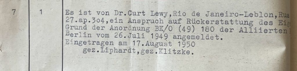Bereits im September 1949, lange vor seiner Rückkehr aus Brasilien nach Deutschland, hatte Lewy gegenüber den deutschen Behörden einen Anspruch auf Rückerstattung (Restitution) seines früheren Eigentums angemeldet (2); auch einen Antrag auf Entschädigung (3) wegen entgangener Berufschancen, Schaden an seiner Gesundheit durch die erzwungene Emigration, Erstattung der bezahlten Reichsfluchtsteuer der Familie (54.409 Reichsmark, was einem Vermögen von 218.000 RM entsprach) und der Kosten des Kapitalistenvisums für Brasilien (131.800 Mark für die Eheleute und die Mutter) machte er geltend, neben den Reisekosten und anderen Verlusten aus Hausrat. Vertreten wurde er in beiden Fällen durch einen Rechtsanwalt und Notar aus Steglitz, der die Familie Lewy noch aus der Studienzeit kannte.