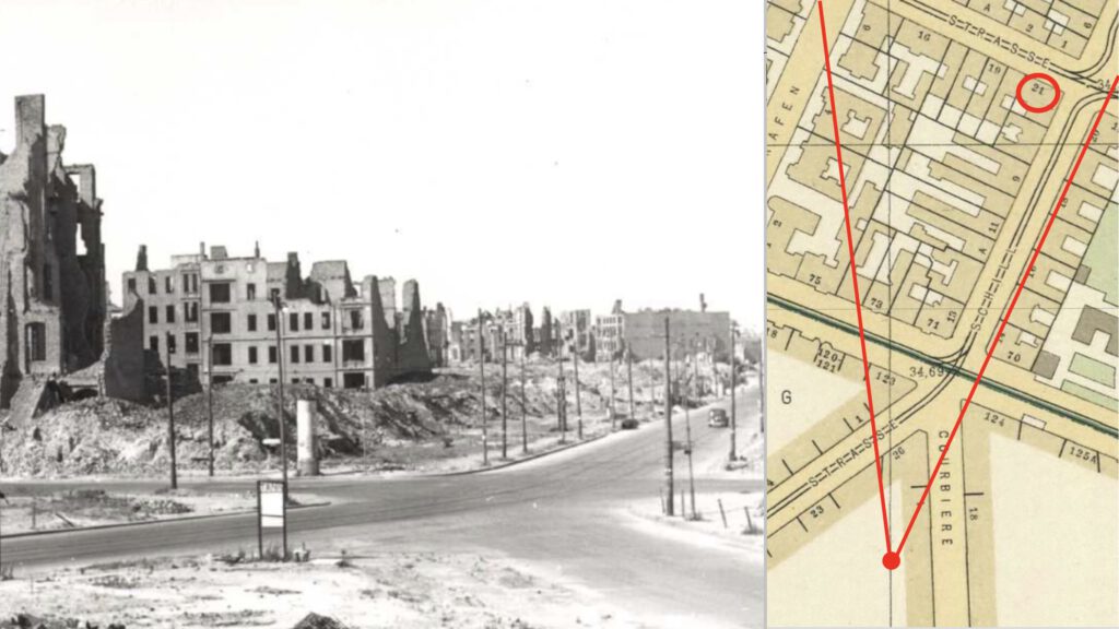 Bild 3: Blick entlang der Schillstraße nach Norden (Aufnahme Willy Kiel 1949, Landesarchiv, ID Nr., 2128 mit freundlicher Genehmigung); rechts ein Auszug aus einem Stadtplan von 1910 mit dem vermutlichen Standort und Blickwinkel des Fotografen. Der rote Kreis markiert den Platz der – zerstörten – Apotheke.