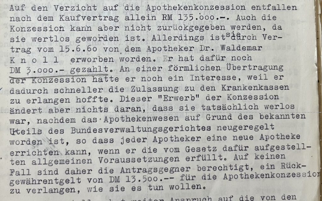 Zu einem besonderen Streitpunkt entwickelte sich der für die Apothekenkonzession gezahlte Kaufpreis von 135.000 RM. Obwohl eine Rückübertragung an Curt Lewy ohne Widerspruch erfolgte, erwies sich dies als finanzielles Desaster. War diese Konzession zu Beginn des Wiedergutmachungsverfahren nämlich noch etwa 70.000 DM wert, zu der sie 1956 hätte weiterverkauft werden können – es lag ein diesbezügliches Angebot vor – so kam es aufgrund eines Urteils der Bundesverfassungsgerichts vom 29. November 1959 (Bild 4) im Verlauf des Restitutionsprozesses zu einer veränderten Rechtslage.
