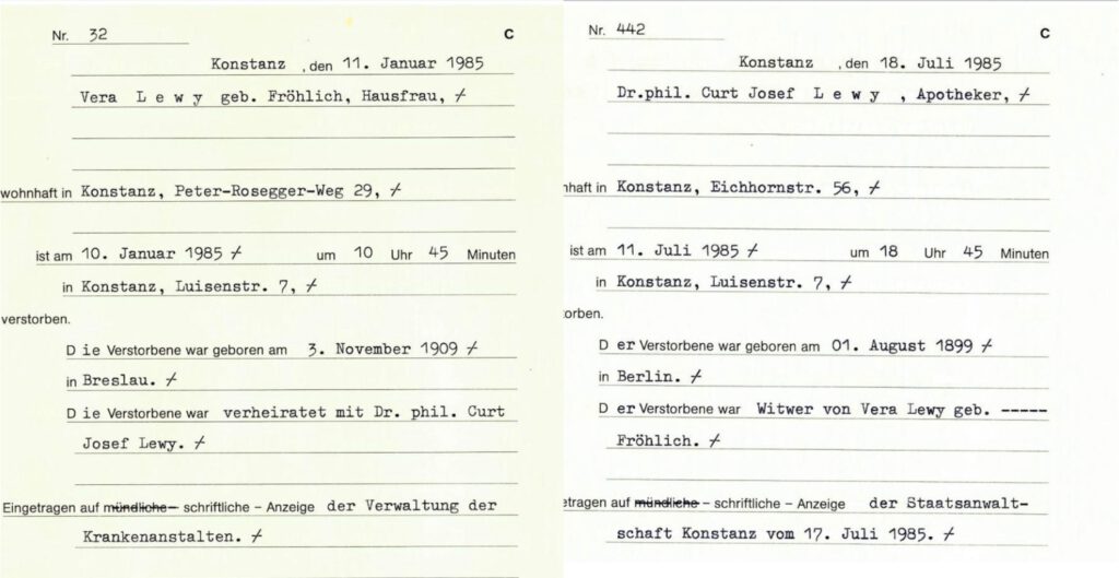 Curt Lewy verstarb am 11. Juli 1985 in Konstanz im Alter von 86 Jahren. Seine Frau Vera Lewy geborene Fröhlich, die mit ihm nach Deutschland zurückgekehrt war, starb wenige Monate zuvor, am 10. Januar 1985 im Alter von 75 Jahren (Bild 6).