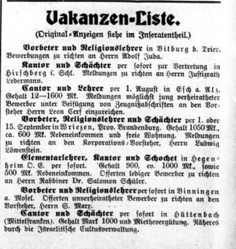 Und Benjamin, inzwischen meistens Benno Ledermann genannt, engagierte sich: Im Verband der Synagogen-Gemeinden der Regierungsbezirke Breslau und Liegnitz bei dessen Gründung 1897 und in den nachfolgenden Jahren, im Deutschen Reichsverband jüdischer Religionslehrer, bei der Gründung eines jüdischen Lehrerheims, im „Verband für jüdische Geschichte und Litteratur“, im Israelitischen Frauenhilfe-Verband Hirschberg, im Vorstand des jüdischen Kurhospitals Warmbrunn. Und wenn in Stonsdorf, einem Dorf in der Nachbarschaft Hirschbergs, 1910 das Jubiläum zum 100-jährigen Bestehen des „Echt Stonsdorfer Kräuterschnapses“ gefeiert wurde, gab der Justizrat auch dort einen „Rückblick auf die Entwicklung der Firma“ (3). Selbst so alltägliche Dinge wie die Suche nach einem Vertreter für den Kantor und Schächter seiner Gemeinde gingen offensichtlich nicht ohne sein Zutun (Bild 4).