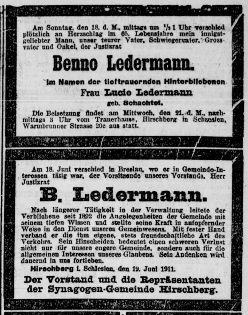 Der Kreisrichter Benno Ledermann in Beuthen (Oberschlesien) hatte sich im Juni 1878 mit Lucie Schachtel verlobt, wie das Berliner Tagblatt (vom 28. Juni 1878) berichtete, und hatte sie am 10. November 1878 in Breslau geheiratet. Sie war die am 26. Juni 1860 geborene Tochter des dortigen Kürschnermeisters Markus Schachtel und dessen Ehefrau Rosalie, geborene Eisenstädt. Im Adressbuch von Breslau 1874 ist die Familie in der Goldenen Radegasse 13 (auch Antonienstr. 3) ansässig, ein Haus in der Innenstadt, das aber nicht dem Kürschner gehörte. Es war die einzige Familie mit diesem Namen in Breslau.
