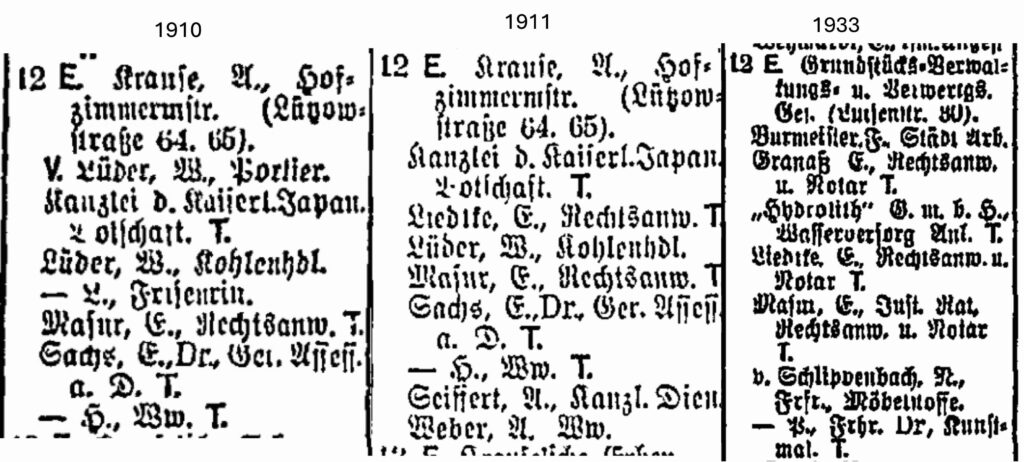 Im Jahr 1910, vor Liedtkes Einzug, war die Beletage sicherlich von der Kanzlei der japanischen Botschaft besetzt, die dort seit 1907 residierte; davor wohnte dort vermutlich der Bankier Landau. Der Kohlenhändler W. Lüder, der gleichzeitig eine Zeitlang Verwalter des Hauses war, wohnte sicherlich im Souterrain. Im folgenden Jahr (1911) ist das Konsulat noch im Hause und Liedtkes sind eingezogen. Als das Konsulat verschwand (1912), zog vermutlich dort ein Pensionat ein, geleitet von Christine Burchardt, das bis 1920 blieb. Von 1921 bis 1925 wohnte vermutlich der Geheime Rat W. Quasthoff im Hause in der schönen Etage. Danach wird dort ein paar Jahre (1926, 1927) der Frauenarzt S. Westhoff seine Praxis gehabt haben; ab 1929 waren bis zur Kriegszerstörung Paul von Schlippenbach und seine Frau die Mieter. In all den Jahren seit 1904 gab es einen weiteren Juristen im Hause, den Rechtsanwalt, Notar und späteren Justizrat Masur (1905 bis 1933), der daher vermutlich die Wohnung über den Liedtkes bewohnte, in der früher Hedwig Schönfließ gewohnt hatte; er hatte möglicherweise angefangen als Untermieter von Hedwig Schönfließ. Und im Souterrain hatte immer auch neben dem Portier ein Handwerker (Schlosser), eine Putzmacherin (Hutmacherin), ein Kutscher, eine Friseuse oder eine Haarhandlung Wohnung und vermutlich Arbeitsplatz.
