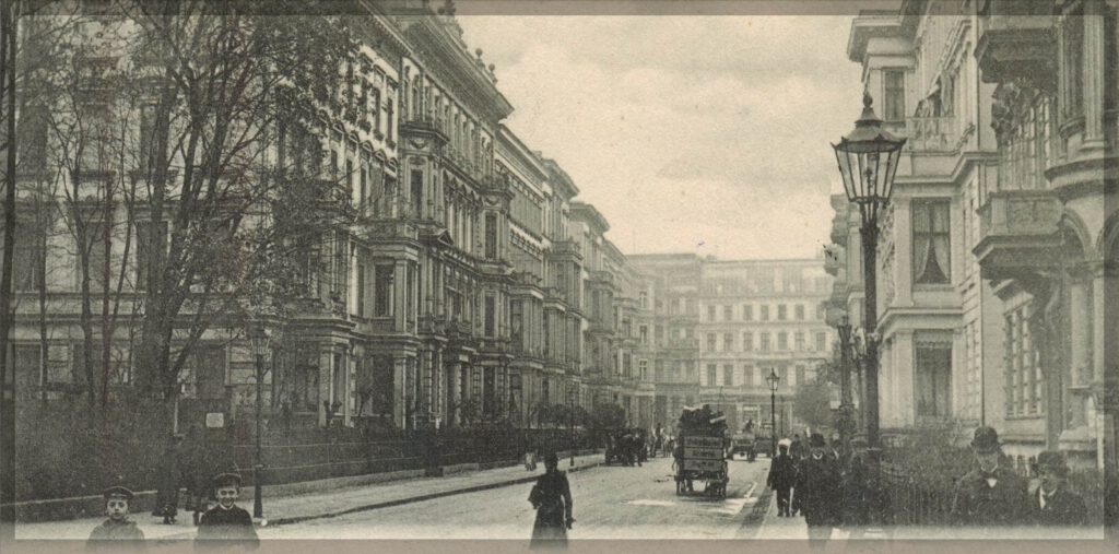 Bleibt eine letzte Frage, die zu beantworten nicht ganz leichtfällt: Da die Liedtkes kein eigenes Haus hatten, was mögen sie für diese Wohnung an Miete bezahlt haben? Wir haben von diesem Haus keine Angaben über Mieteinnahmen gefunden, kennen aber Mietpreise in Objekte in unmittelbarer Nähe, am Lützowplatz, aus dieser Zeit. Dort hatte die Finanzverwaltung 1888 die Eigentümer der Häuser rund um den Lützowplatz (mittendran vom 26. Januar 2025) nach den Mieten befragt und festgelegt, welchen Geldwert eine Wohnung bei Eigennutzung hatte (5). Grob gesagt betrug die Jahresmiete einer 300 qm Wohnung im Mittel etwa 3000 Reichsmark, was einem heutigen Geldwert von ungefähr 25.000 € entspricht (6). Wohlgemerkt handelt es sich um die Jahresmiete, nicht die Monatsmiete, die hätte dann etwa bei einem 2000 €-Kaufkraft-Äquivalent gelegen. Da die Wohnungen am Lützowplatz exklusiver waren als im Blumeshof (allein schon wegen der Lage am Platz), nehmen wir an, dass die zwischen 250 qm große Wohnung der Liedtkes im Jahr 1910 vielleicht eine Jahresmiete von 2500 Mark kostete, bei einem Jahreseinkommen des Ernst Liedtke von mehr als 50.000 Mark, wie im Entschädigungsverfahren nach dem Krieg (mittendran vom 26. Oktober 2025) geschätzt worden war. Der Anteil der Miete an den Lebenshaltungskosten war also vor 100 Jahren mit 5% deutlich geringer als heute.