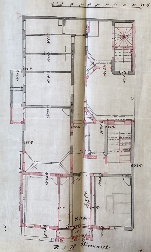 Vermutlich lagen die Schlafzimmer alle entlang des langen Flures, und sicherlich war so viel Platz, das jedes der drei Mädchen ihr eigenes „Reich“ haben konnte. Laut Grundriss waren dies insgesamt fünf größere und kleinere Zimmer mit Fenstern zur Gasse zwischen Nr. 12 und Nr. 13, und zwei kleinen Balkonen. Interessant ist der Raum am Ende des Ganges in den kurzen Querflügel: Man könnte sich vorstellen, dass dies als exklusives Arbeits- und Besprechungszimmer des Rechtsanwalts und Notars Ernst Liedtke diente, oder als Gästezimmer für Besucher, die die Familie hatte, und vielleicht auch später das Fotostudio beherbergte, dass die älteste Tochter betrieb.