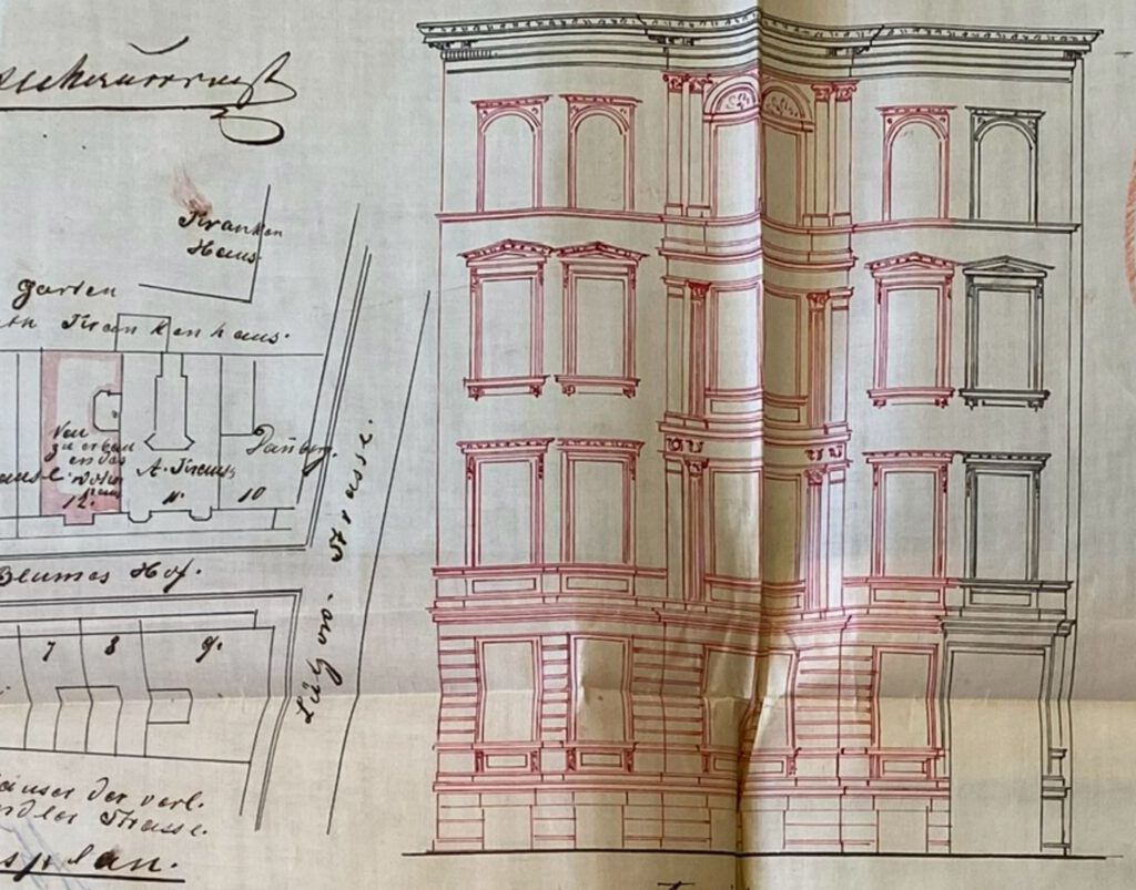 Das Haus war 1871 bis 1873 gebaut worden, es war die Erstbebauung dieses zunächst als Privatstraße geplanten Terrains, das bis 1861 dem Unternehmer Jungbluth gehörte, der hier einen Gewerbehof betrieben hatte (mittendran vom 7. September 2023). Jungbluth verkaufte es an den Bankier Johann Carl Blume, der das Terrain parzellierte und weiterverkaufte. Auf diese Weise entstanden bis 1874 sechzehn Wohnhäuser zwischen der Lützowstraße und dem Schöneberger Ufer, mit repräsentativen Straßenfronten (Bild 2), aber durchaus auch vielen engen Hinterhöfen zwischen Seiten- und Querflügeln. Daher entstammten die Einwohner der sozialen Mittel- und Oberschicht ebenso wie der Arbeiterschaft, ein Querschnitt der Berliner Bevölkerung, wenn man sich die Berufe der etwa 100 Mieter (Familien) zu jedem Zeitpunkt zwischen 1880 und 1935 anschaut. Blumeshof 12 machte da keine Ausnahme. Gegen Ende der Periode wurden mehr und mehr Wohnungen durch Büroräume ersetzt, da die Nähe zum Regierungsviertel die Lage attraktiv machte für Firmen, Kanzleien, Hotels und Behörden, und dies die Preise nach oben trieb.