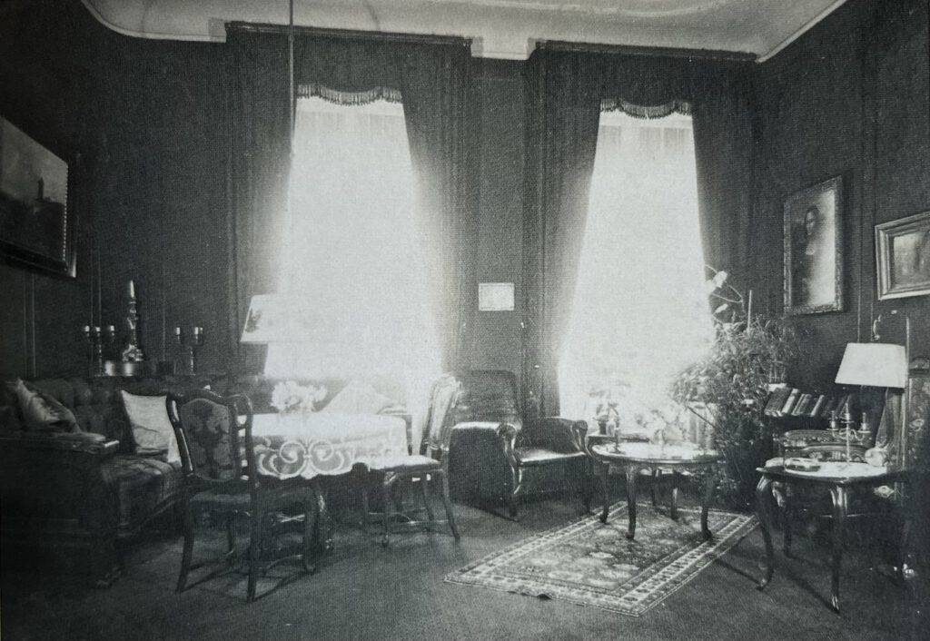 Verglichen mit heutigen „bürgerlichen“ Wohnungen waren die Wohnungen um und nach der Jahrhundertwende 1900 dunkel. Das lag nicht nur an verhältnismäßig kleinen Fenstern, sondern auch daran, dass im Inneren dunkle Farben bevorzugt wurden, schwere Brokatvorhänge, dunkle Tapeten, dunkles Parkett und Teppiche. Genau so sah es auch bei den Liedtkes aus, von deren Wohnzimmer es ein Foto gibt (Bild 6) (1).