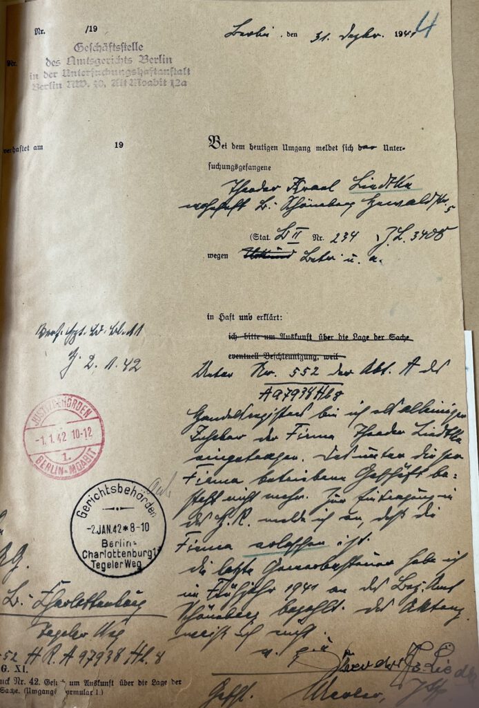Mit Datum vom 31. Dezember 1941 erklärte der Untersuchungsgefangene Theodor Liedtke, in Haft wegen „Betr u.a.“ in einem Formblatt gegenüber dem Amtsgericht, dass das unter seinem Namen betriebene Geschäft nicht mehr existiere, die Eintragung in das Handelsregister erloschen sei und dass die letzte Zahlung der Gewerbesteuer im Frühjahr 1941 an das Bezirksamt Schöneberg erfolgt sei (Bild 2). Das Amtsgericht veranlasste daraufhin die Löschung der Firma. Die Geschichte der Firma Liedtke ist in der Datenbank jüdischer Gewerbebetriebe bei Kreutzmüller (4) dokumentiert.