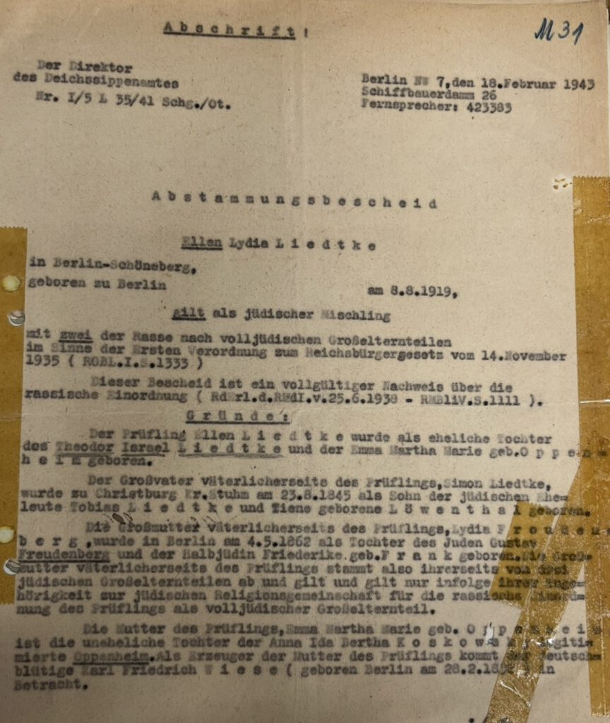 Theodor Liedtke, 1887 in Berlin als einziger Sohn jüdischer Eltern, Schier (Simon) Liedtke und dessen Ehefrau Lydia Freudenberg, geboren, hatte am 14. August 1915 die Emma Martha Oppenheim geheiratet, die 1892 in Berlin zur Welt kam – Emma war ohne Beruf und uneheliches Kind der Näherin Anna Oppenheim (1892-1949). Wir können davon ausgehen, dass diese im Krieg geschlossene Ehe in einem Heimaturlaub des Soldaten Theodor Liedtke stattfand. Ihr einziges Kind, ihre Tochter Ellen kam erst nach dem Krieg zur Welt, am 8. August 1919. Als Ellen 25 Jahre alt war, starb ihre Mutter Emma am 21. Dezember 1934 im St. Norbert-Krankenhaus in Schöneberg im Alter von nur 42 Jahren. Ob sie angesichts und in Folge der zunehmenden Verfolgung jüdischer Familien starb oder an einer tödlichen Erkrankung ergibt sich aus den Unterlagen nicht. Sie selbst hatte als Halbjüdin einen arischen Vater, wie eine Abstammungsurkunde für ihre Tochter Ellen aus dem Jahr 1943 belegt (Bild 3).